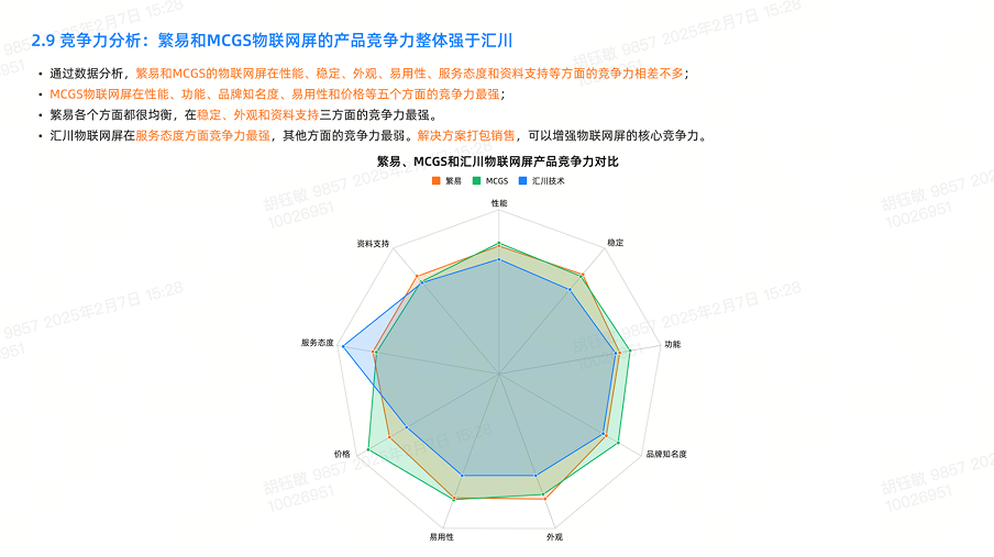 竞品分析:对标繁易、MCGS 等主流竞品,从性能、易用性、价格、服务等维度做雷达图对比;