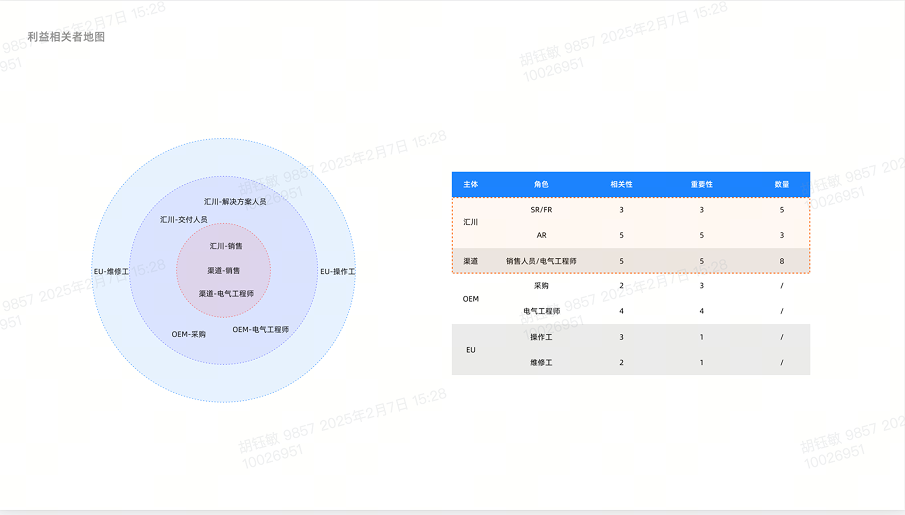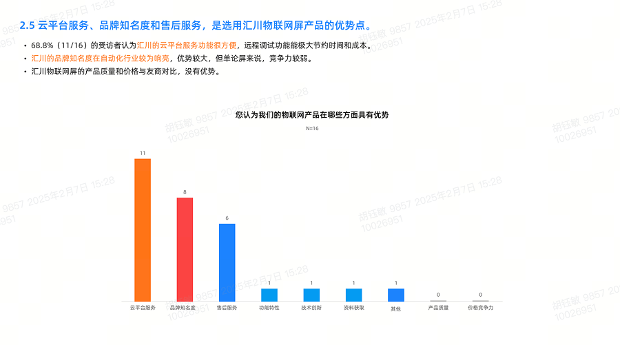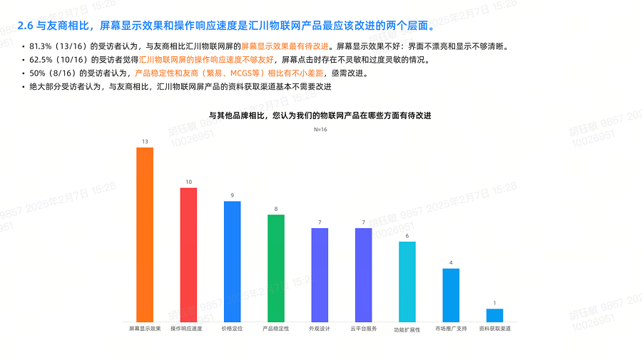 定量调研:设计结构化问卷,回收 16 份有效样本(内部 8 人 + 外部 8 人),覆盖销售、售后、研发、客户等角色,统计认知、使用、满意度数据;