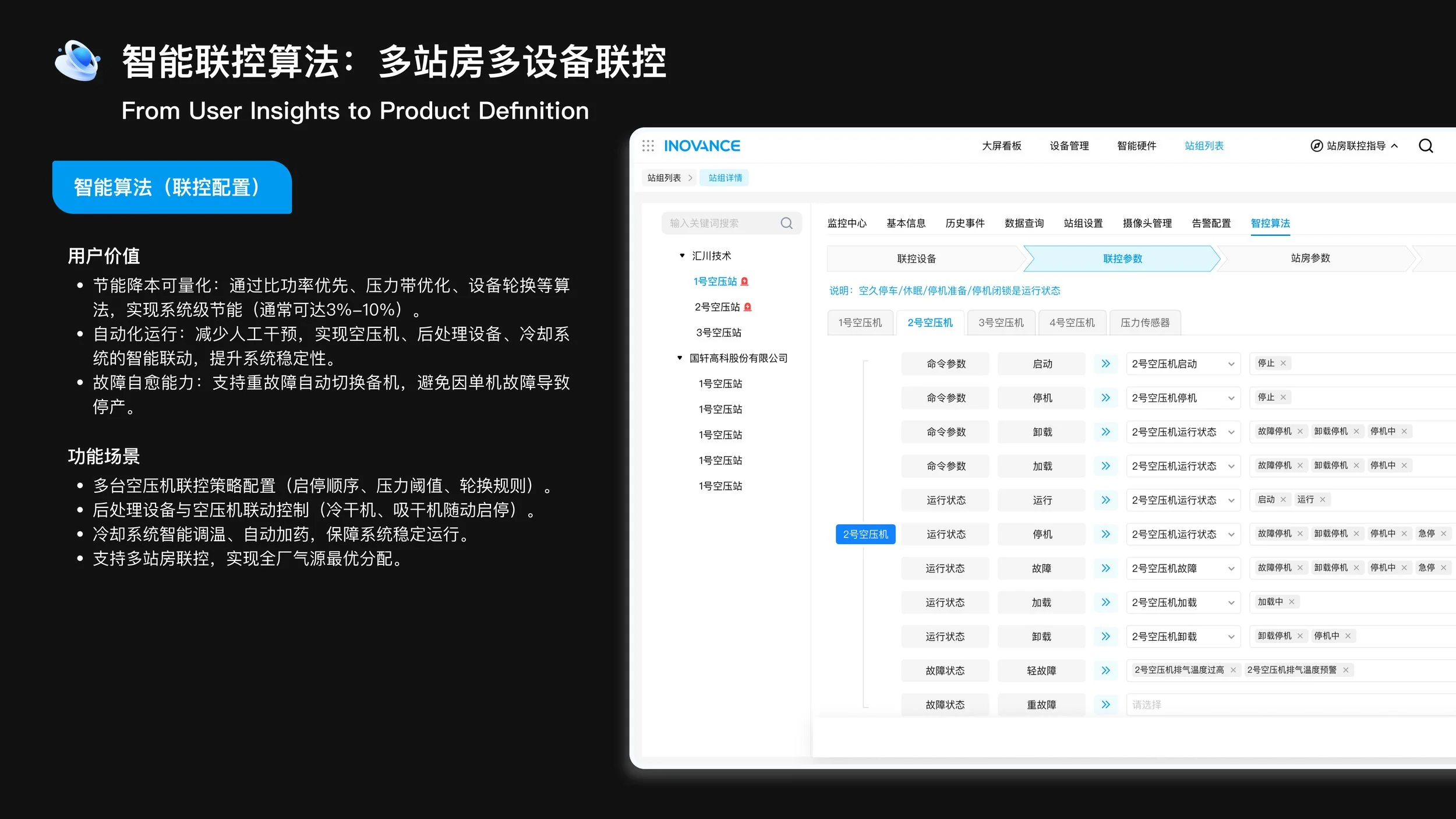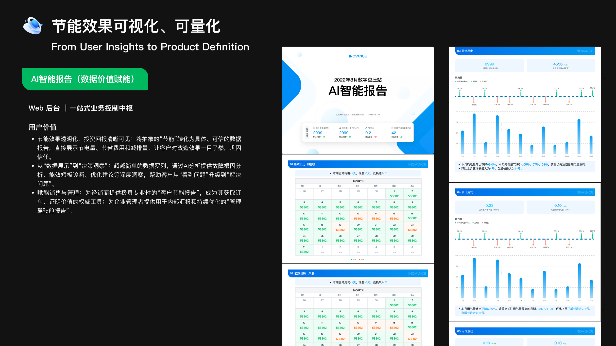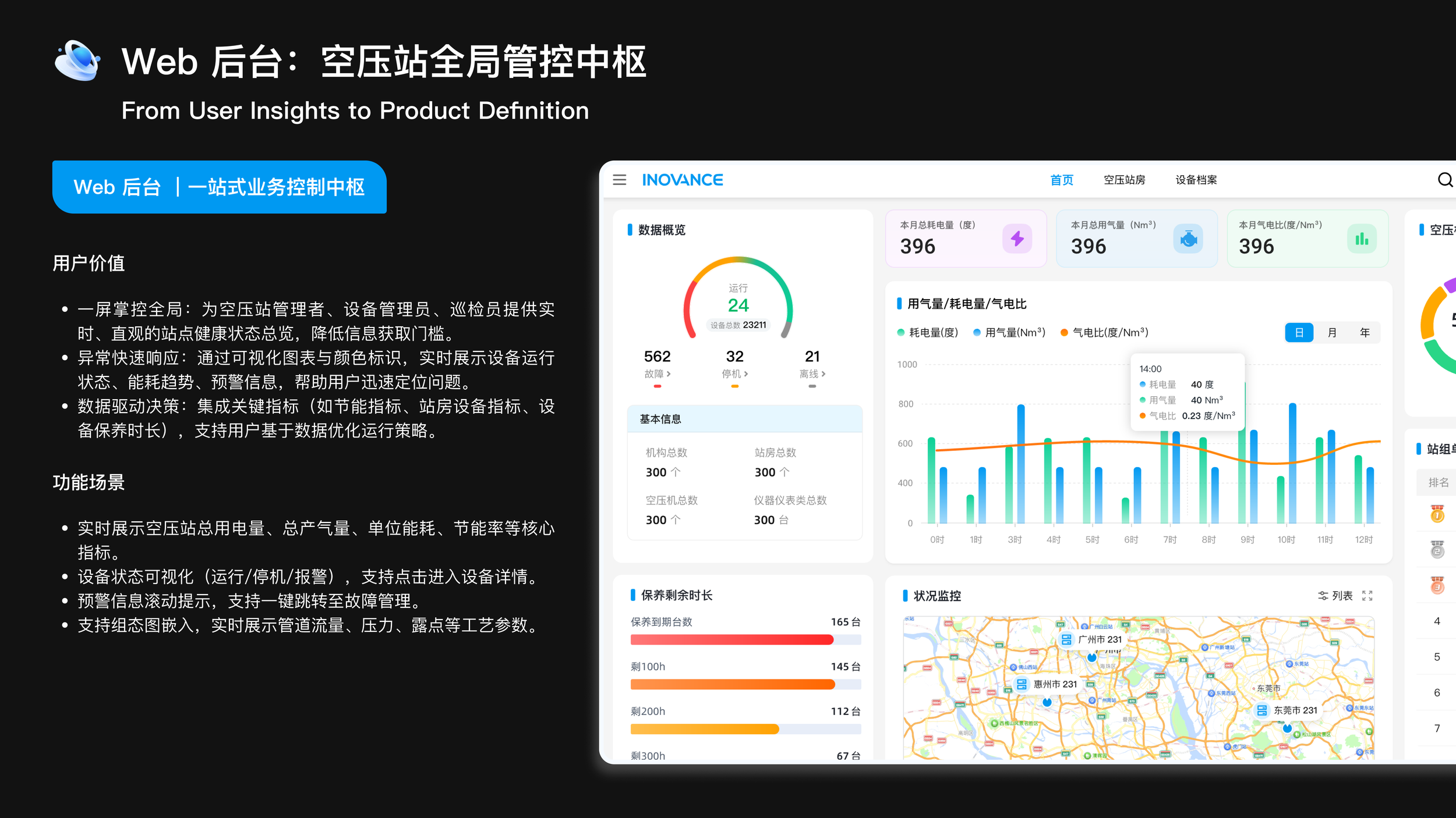 智能空压站 SaaS 聚焦于系统级成果,帮助客户从割裂的设备管理模式,升级为可量化、可验证的节能与成本优化结果。作为服务与体验设计负责人,我重点参与了将复杂的运行数据转化为管理层与业务方都能理解和信任的价值表达方式,识别客户成功痛点。